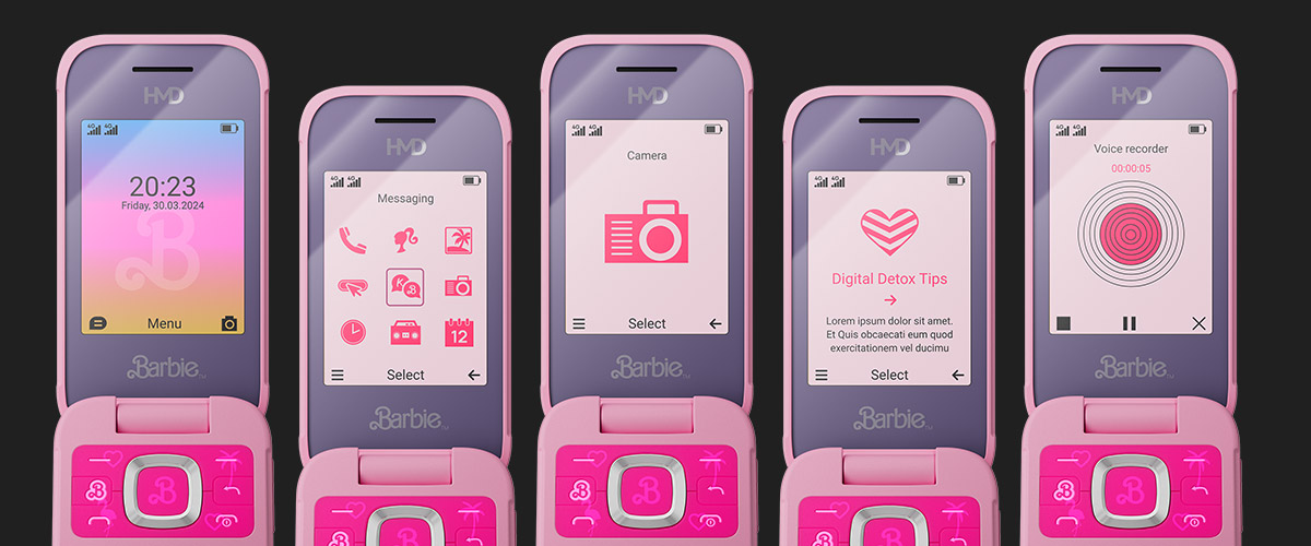 In partnership with Mattel, we created this flip phone as part of the Barbie movie movement and the 65th birthday of the first Barbie doll. Taking the icon Nokia 2660 and customising it to the client’s needs. The product is positioned as a nostalgic, fashion-forward device.